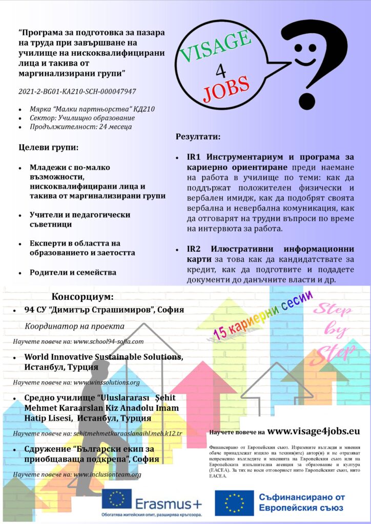 The project initiative, coordinated by the 94 SU “Dimiter Strashimirov” Sofia, where our team is an equal partner together with organisations from Spain and Turkey: VISAGE4JOBS , where we have developed a pre-employment toolkit for career counsellors was presented.